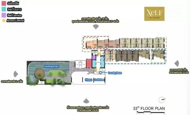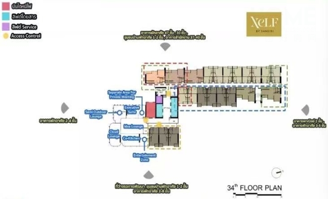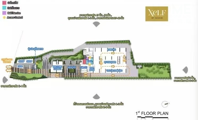 XELF by Sansiri只有一个出入口,位于拉玛四路。该项目的公共区域分布在7、33、34和35层,所有公共区域均面向拉玛四世路及其西侧,毗邻空置区域,以便住户充分欣赏城市景观。项目提供单层公寓和挑高公寓两种房型。