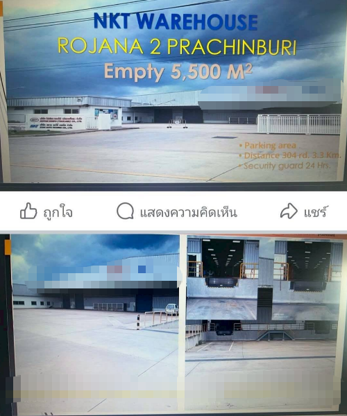 巴真府 | Rojana工业园区里私人工厂仓库出租 6,000平米 每平米150泰铢/月
